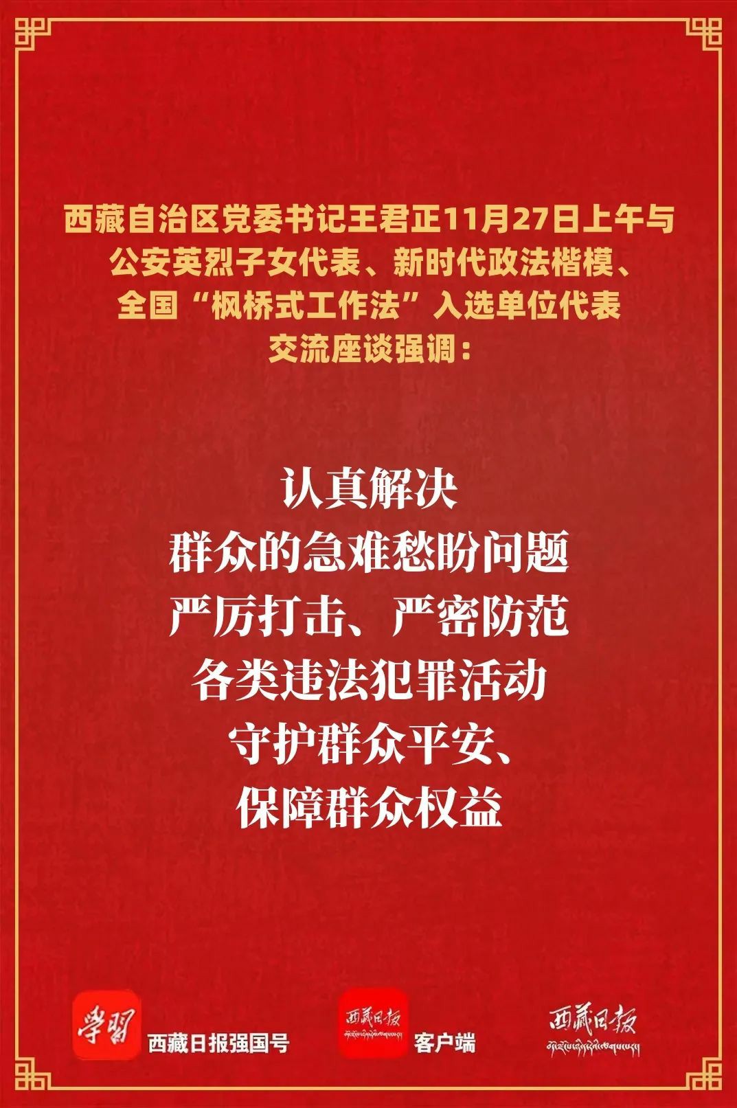 11月27日上午,自治区党委书记王君正与公安英烈子女代表、新时代政法楷模、全国“枫桥式工作法”入选单位代表交流座谈。他强调,要传承崇高精神、发扬优良作风、争取更大光荣,为推动西藏长治久安作出新贡献。