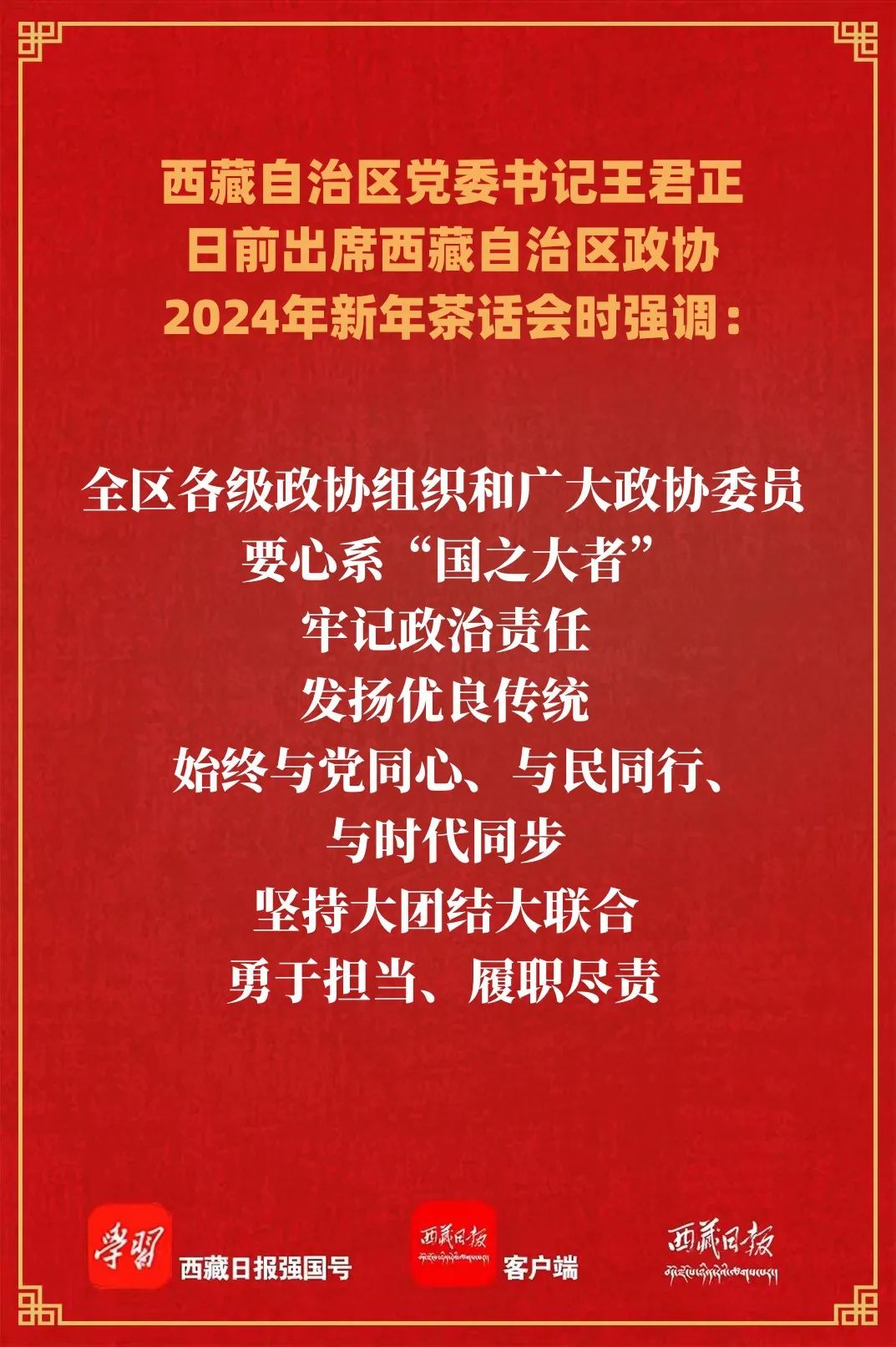 王君正强调,2024年是落实自治区第十次党代会部署的攻坚之年。全区各级政协组织和广大政协委员要心系“国之大者”,牢记政治责任,发扬优良传统,始终与党同心、与民同行、与时代同步,坚持大团结大联合,勇于担当、履职尽责。围绕自治区党委工作安排和部署,加强政治协商、民主监督、参政议政,全力做好扩大共识、凝聚人心的工作,努力把各族各界群众团结起来,调动一切积极因素,形成建设美丽幸福西藏、共圆伟大复兴梦想的强大合力,为全面建设社会主义现代化新西藏贡献更多智慧和力量。