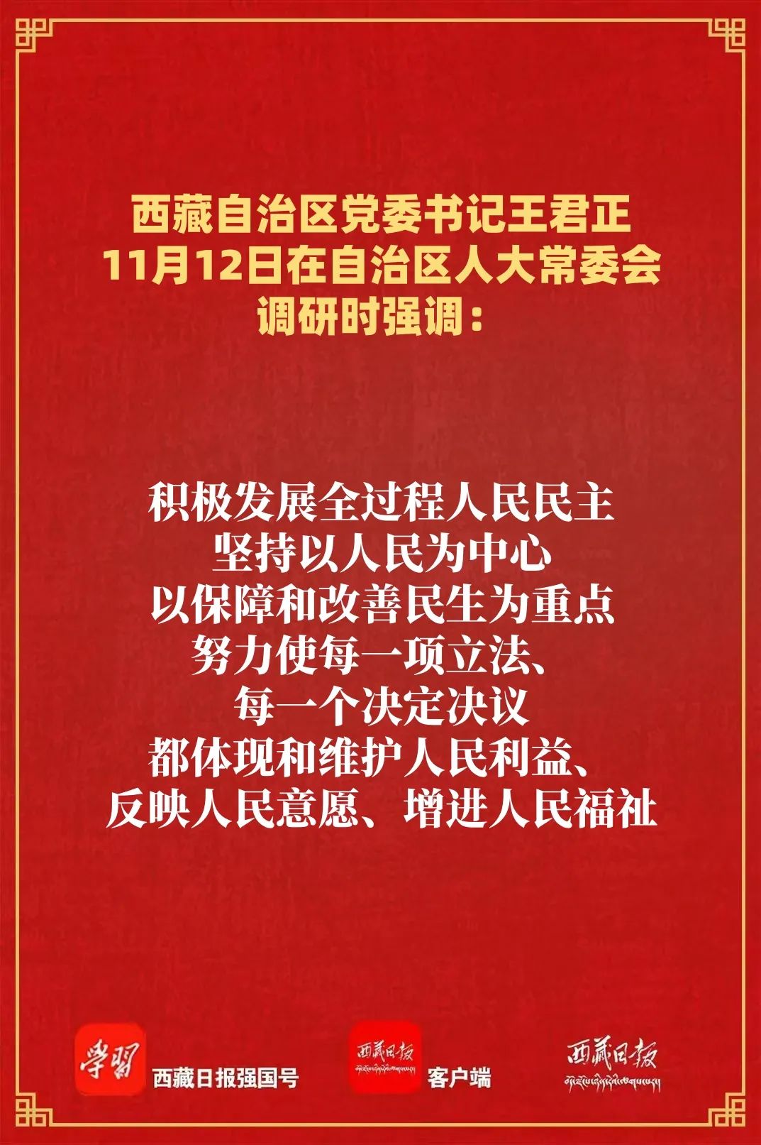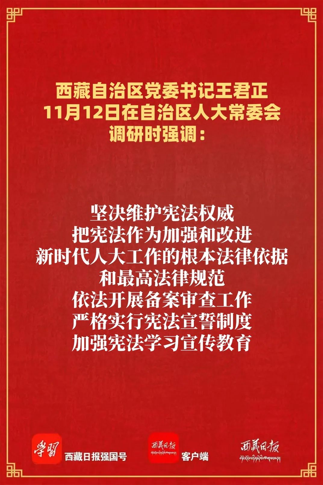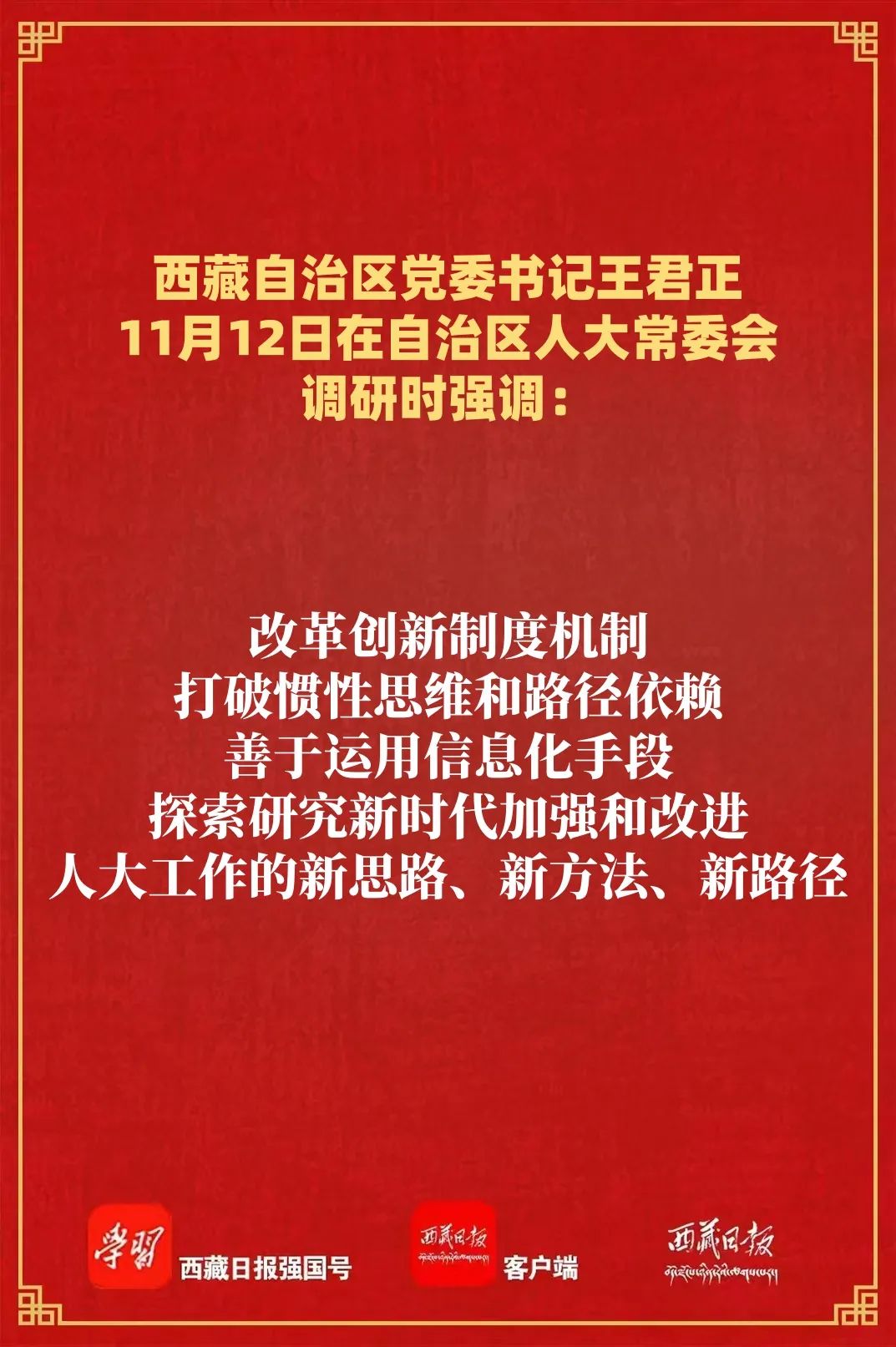 11月12日上午,自治区党委书记王君正来到自治区人大常委会调研。强调,要坚持以习近平新时代中国特色社会主义思想统揽人大工作全局,深入贯彻落实习近平总书记关于坚持和完善人民代表大会制度的重要思想,继承光荣传统,发扬优良作风,努力推动新时代西藏人大工作高质量发展,为建设社会主义现代化新西藏作出更大贡献。