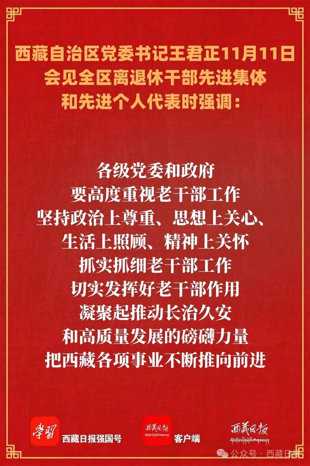王君正强调,老干部是党和国家的宝贵财富。各级党委和政府要高度重视老干部工作,坚持政治上尊重、思想上关心、生活上照顾、精神上关怀,抓实抓细老干部工作,切实发挥好老干部作用,凝聚起推动长治久安和高质量发展的磅礴力量,把西藏各项事业不断推向前进。
