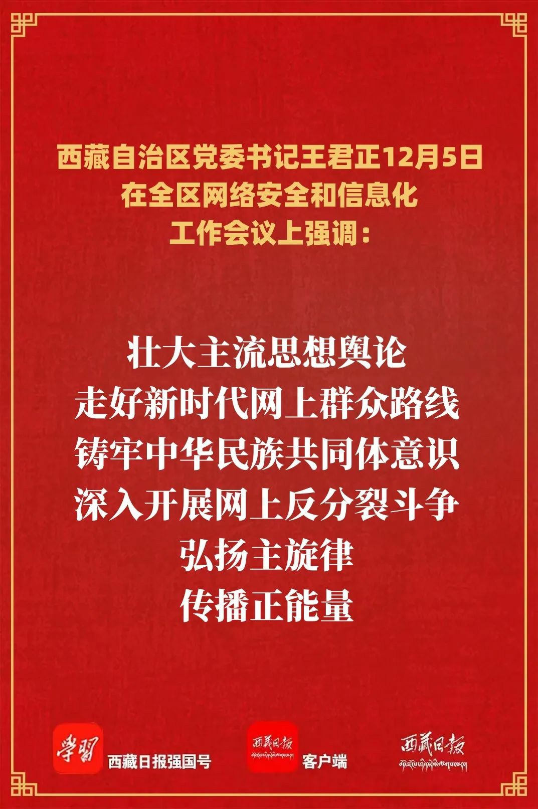 12月5日,全区网络安全和信息化工作会议在拉萨召开。自治区党委书记王君正出席并讲话,强调要深入贯彻落实习近平总书记关于网络强国的重要思想,适应形势发展,突出工作重点,不断提升全区网络安全和信息化工作水平,为全面建设社会主义现代化新西藏提供有力保障。