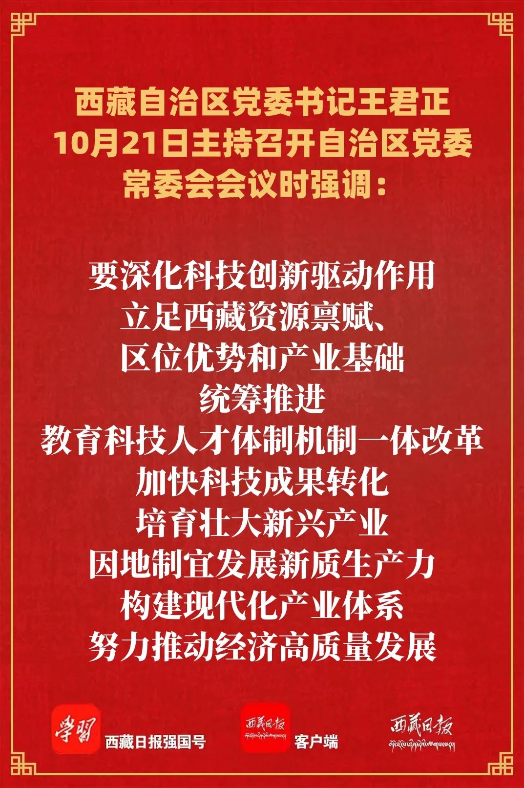 王君正强调,要深化科技创新驱动作用,立足西藏资源禀赋、区位优势和产业基础,统筹推进教育科技人才体制机制一体改革,加快科技成果转化,培育壮大新兴产业,因地制宜发展新质生产力,构建现代化产业体系,努力推动经济高质量发展。深化经济体制改革牵引作用,聚焦重点领域和关键环节,抓好民生领域、经济领域等改革任务落地,持续优化营商环境,提高对内对外开放水平,积极主动服务和融入新发展格局。深化区域协同联动作用,主动对接国家区域发展战略,优化重大基础设施、重大生产力和公共资源布局,建立健全体制机制和政策体系,全面推进乡村振兴,加快城乡融合发展步伐。深化文旅产业拉动作用,坚持以文塑旅、以旅彰文,推动文化强区、旅游强区建设,充分挖掘整合西藏特色文化资源,加快发展新型文化业态,促进文化和旅游深度融合发展。大力发展民生事业,提高红十字会人道服务能力,带动社会公益事业和精神文明建设,重视老龄工作,深入开展新时代“银龄行动”,持续增进人民福祉。强化党建引领,不断完善矛盾纠纷排查化解机制,切实将矛盾纠纷化解在基层、消除在萌芽状态,不断提升基层治理效能,努力建设更高水平的平安西藏。树牢总体国家安全观,坚持警钟长鸣、警惕常在,坚定不移做好维护稳定各项工作,落实好各项维稳要求和措施,健全党政军警民合力强边固防机制,筑牢国家安全屏障。