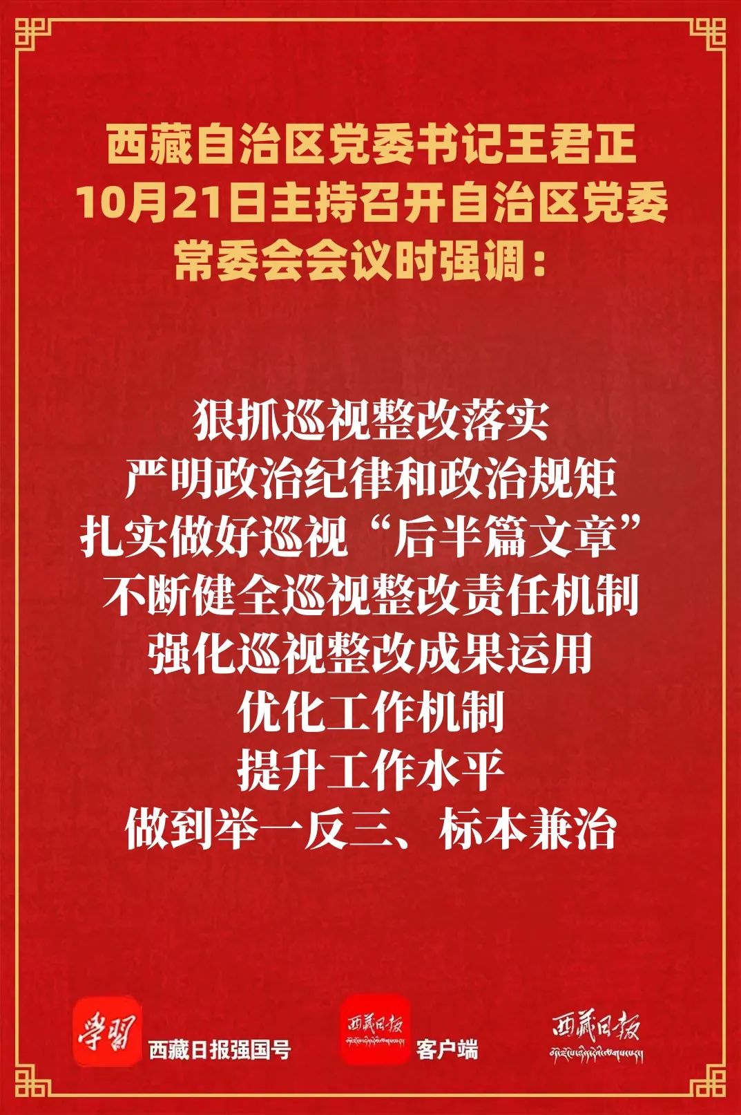 会议听取了十届自治区党委第三轮巡视整改和第五轮巡视情况汇报。王君正强调,全区各级各部门要切实提高政治站位,深入学习领会习近平总书记关于全面深化改革的一系列新思想新观点新论断,进一步增强责任感使命感,围绕中心、服务大局,总结经验、把握规律,认真贯彻新修订的巡视工作条例,持续深化政治巡视,长期抓、抓长期,以改革精神推动巡视工作高质量发展。狠抓巡视整改落实,严明政治纪律和政治规矩,扎实做好巡视“后半篇文章”,不断健全巡视整改责任机制,强化巡视整改成果运用,优化工作机制,提升工作水平,做到举一反三、标本兼治。用好科学工作方法,坚持问题导向,巩固成果、健全机制,自觉把党中央决策部署和自治区党委工作要求放在心上、扛在肩上、抓在手上,不断推动西藏长治久安和高质量发展。