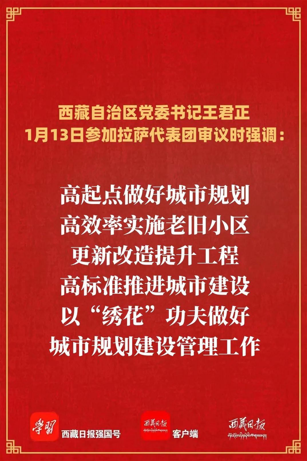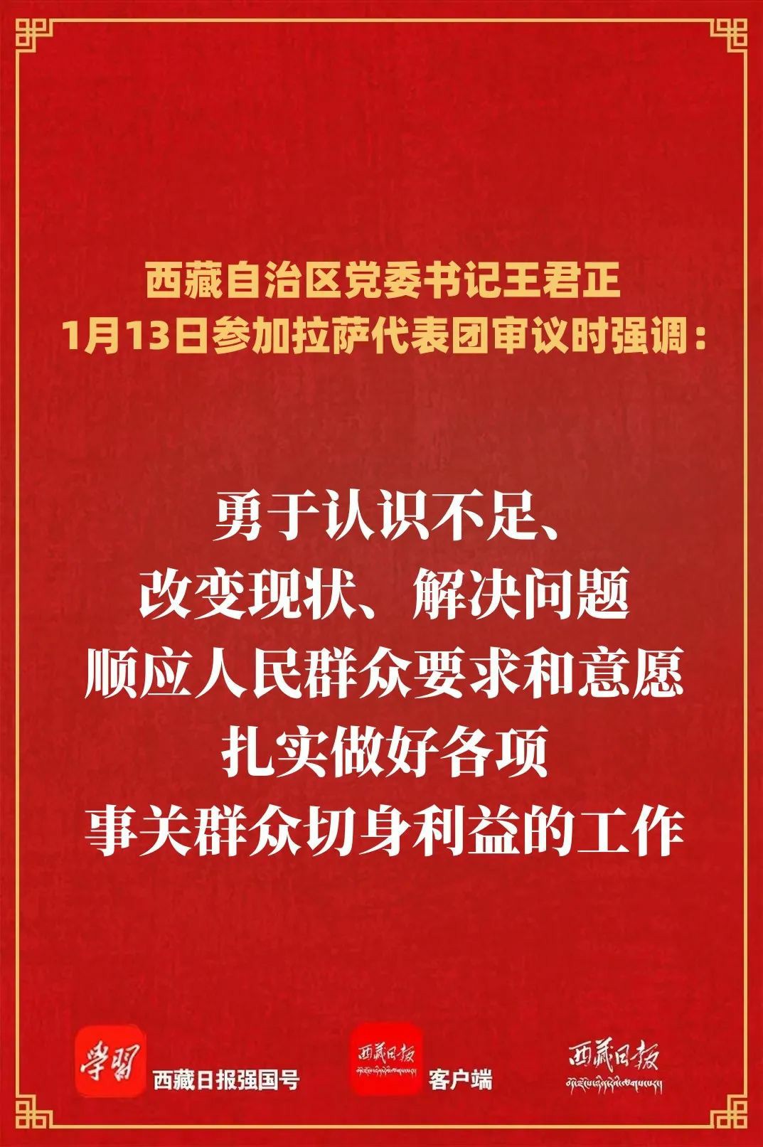 1月13日下午,自治区党委书记王君正参加自治区十二届人大一次会议拉萨代表团审议。强调,要深入学习贯彻党的二十大精神,贯彻落实习近平总书记关于西藏工作的重要指示和新时代党的治藏方略,坚持以人民为中心的发展思想,在总结成绩中坚定发展信心,在迎接挑战中提升工作水平,在抢抓机遇中加快发展,努力当好全区经济社会发展排头兵,为西藏长治久安和高质量发展作出拉萨贡献。