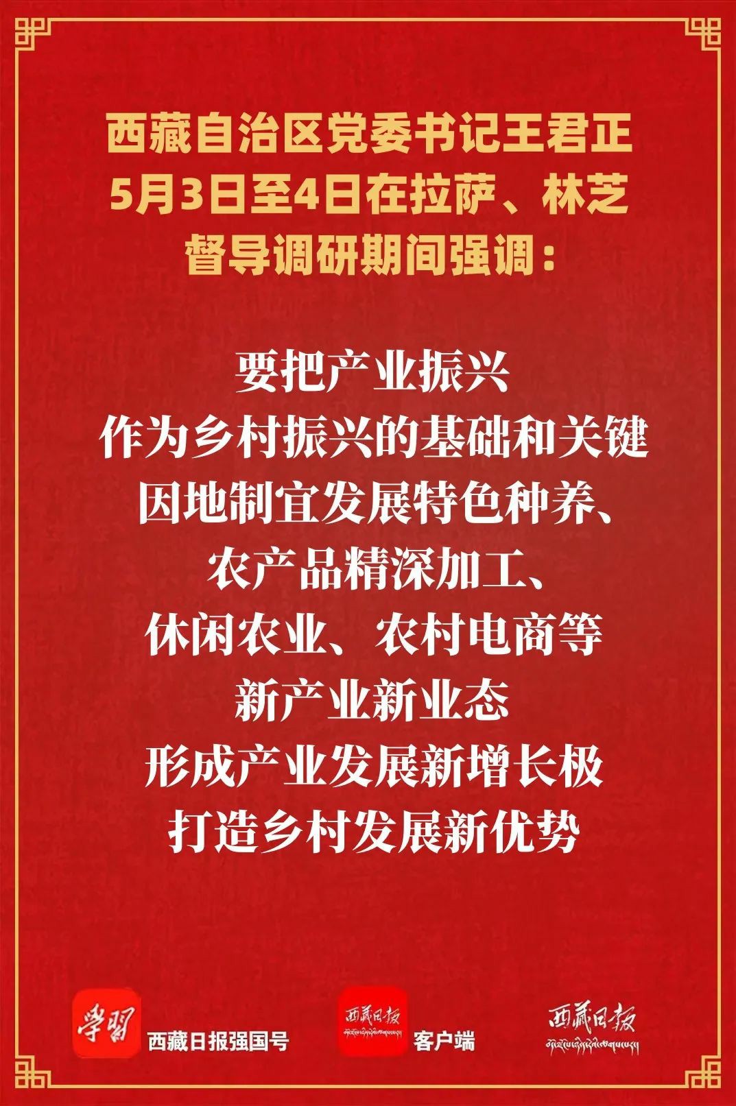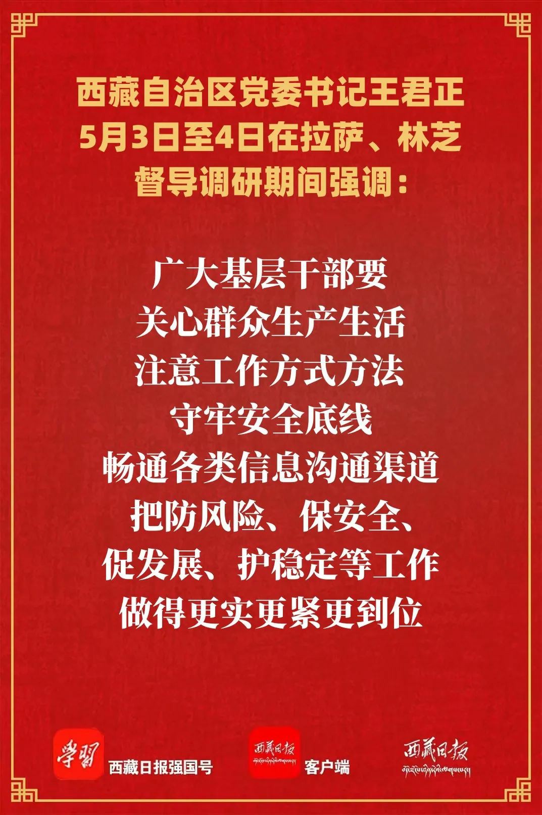 5月3日至4日,自治区党委书记王君正在拉萨市墨竹工卡县日多乡、林芝市巴宜区布久乡调研节日值班备勤、乡村振兴、安全生产等工作,并看望西藏农牧学院广大青年和青年工作者。强调,要坚持以习近平新时代中国特色社会主义思想为指导,深入贯彻落实习近平总书记关于西藏工作重要指示和新时代党的治藏方略,关心群众生产生活,注意工作方式方法,扎实开展好主题教育,不断增强各族群众获得感幸福感安全感,以长治久安和高质量发展的实际成效检验主题教育成果。