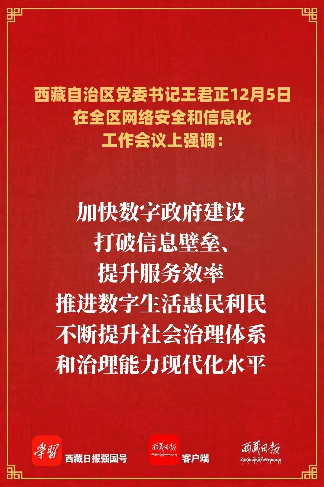 要在信息化引领上狠下功夫,积极推动数字西藏建设。加快推进能源、交通、水利、生态环保等重大基础设施数字化建设,打牢数字西藏基础;拓展大数据多领域应用,积极促进数字经济与实体经济深度融合,推动产业数字化、数字产业化;加快数字政府建设,打破信息壁垒、提升服务效率,推进数字生活惠民利民,不断提升社会治理体系和治理能力现代化水平。