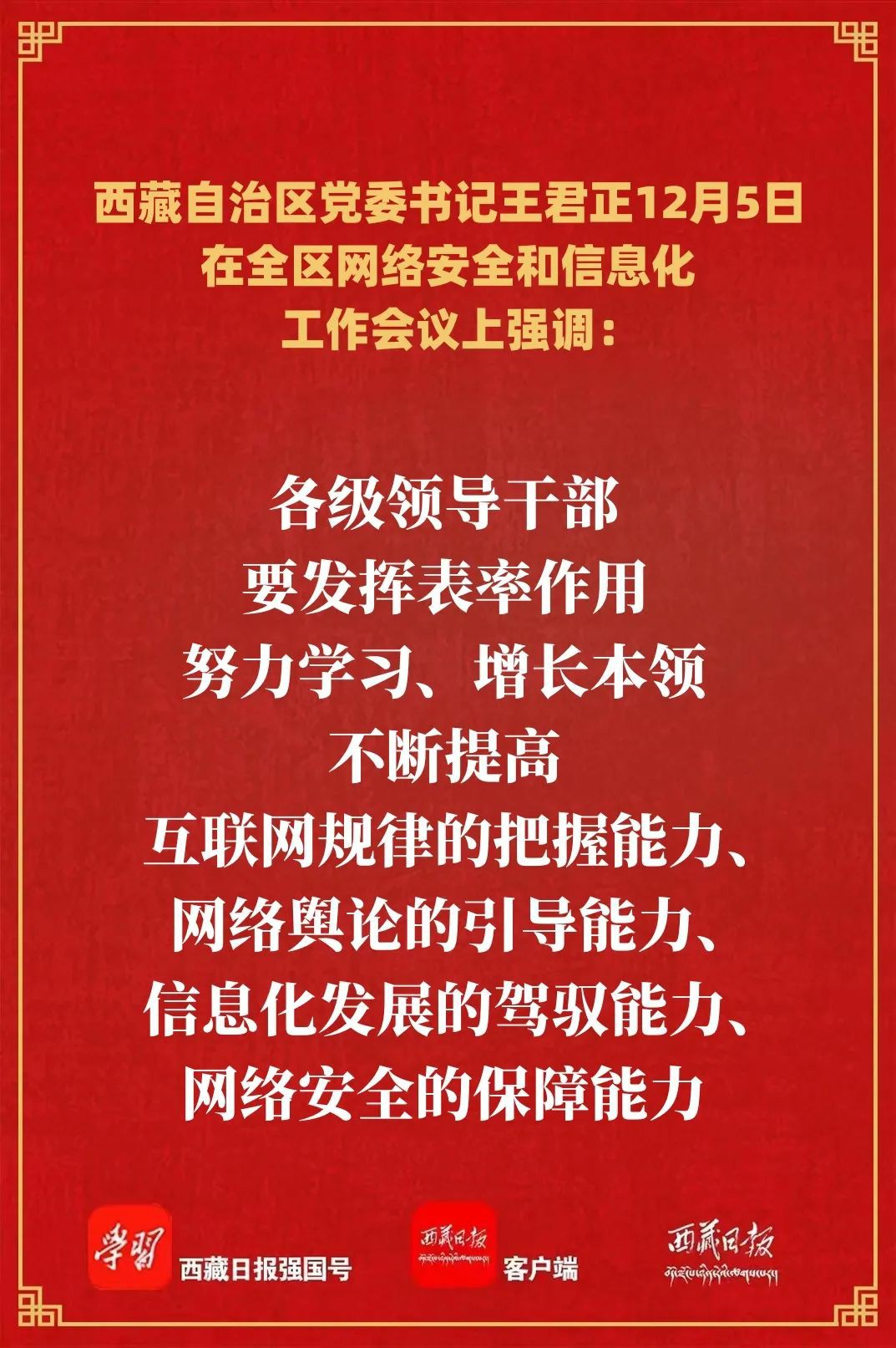 12月5日,全区网络安全和信息化工作会议在拉萨召开。自治区党委书记王君正出席并讲话,强调要深入贯彻落实习近平总书记关于网络强国的重要思想,适应形势发展,突出工作重点,不断提升全区网络安全和信息化工作水平,为全面建设社会主义现代化新西藏提供有力保障。