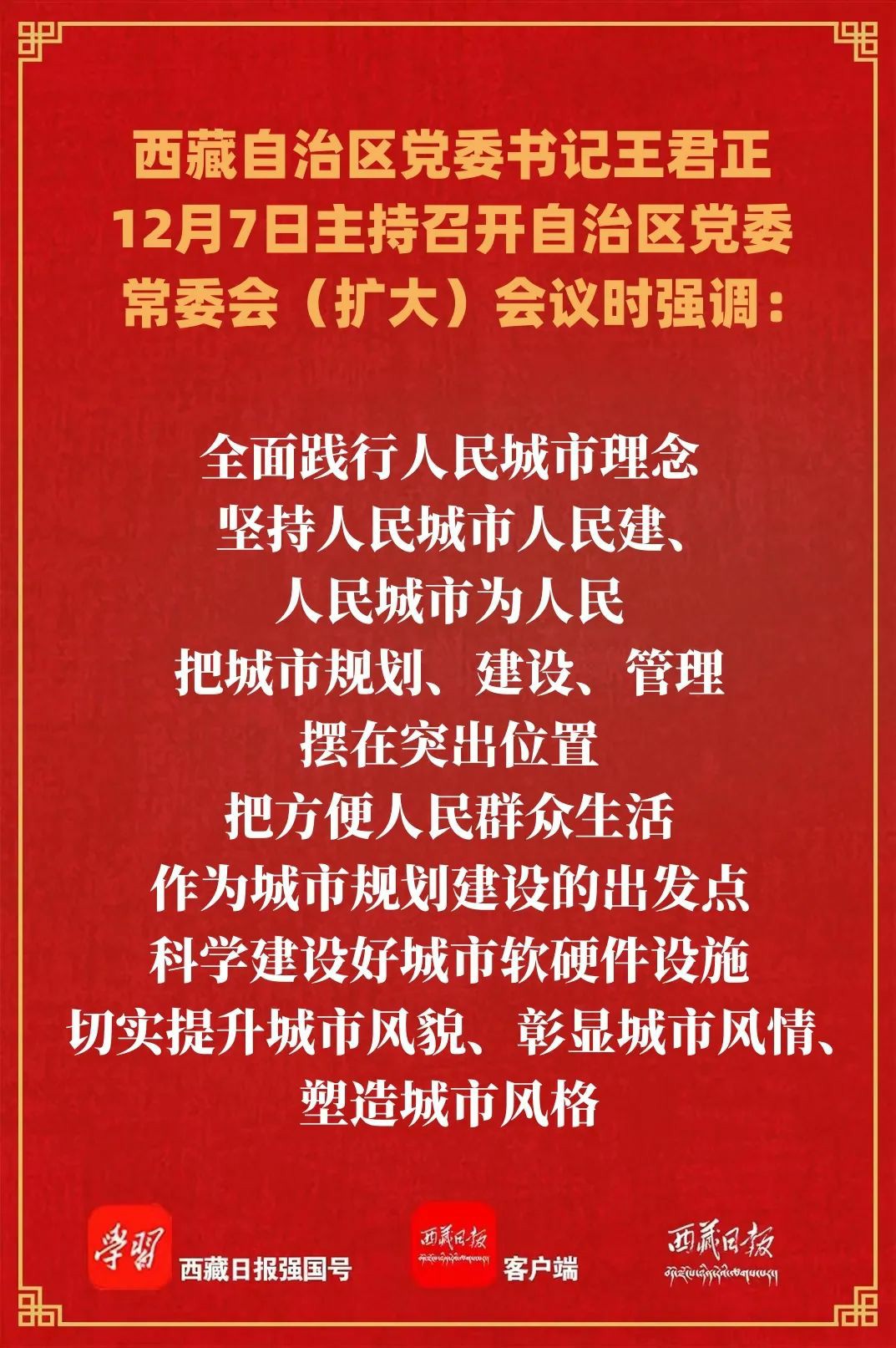 王君正强调,全区各级各部门要牢牢把握西藏在党和国家工作大局中的战略定位,结合西藏实际,把握形势任务,坚定不移确保习近平总书记和党中央的决策部署落到实处。牢固树立区域协调发展理念,主动融入成渝地区双城经济圈、长三角一体化发展等国家战略,深化与四川、重庆、青海、新疆等省区市及有关中央企业的交流合作,更好实现优势互补、互利共赢、共同发展。全面践行人民城市理念,坚持人民城市人民建、人民城市为人民,把城市规划、建设、管理摆在突出位置,把方便人民群众生活作为城市规划建设的出发点,科学建设好城市软硬件设施,切实提升城市风貌、彰显城市风情、塑造城市风格。以高水平安全保障高质量发展,警钟长鸣、警惕常在,以科学化的机制和常态化、法治化的理念把维稳工作做在日常、做到基层,坚持和发展新时代“枫桥经验”“浦江经验”,不断提升社会治理体系和治理能力现代化水平。大力提升文化软实力,践行社会主义核心价值观,传承和弘扬红色文化,繁荣文化产业,创新文化业态,大力推动文旅产业深度融合,深化文化体制改革,激发文化创新活力,更好满足人民群众精神文化需求。