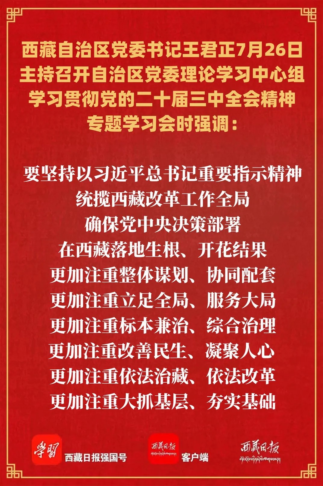 7月26日上午,自治区党委书记王君正主持召开自治区党委理论学习中心组学习贯彻党的二十届三中全会精神专题学习会。强调,要坚持以习近平总书记重要指示精神统揽西藏改革工作全局,在学深悟透党的二十届三中全会精神特别是习近平总书记重要讲话精神上下功夫,在贯彻落实上用实劲,坚持对标对表、细化转化,以务实担当的精神抓好工作任务落实,努力推动社会主义现代化新西藏建设。