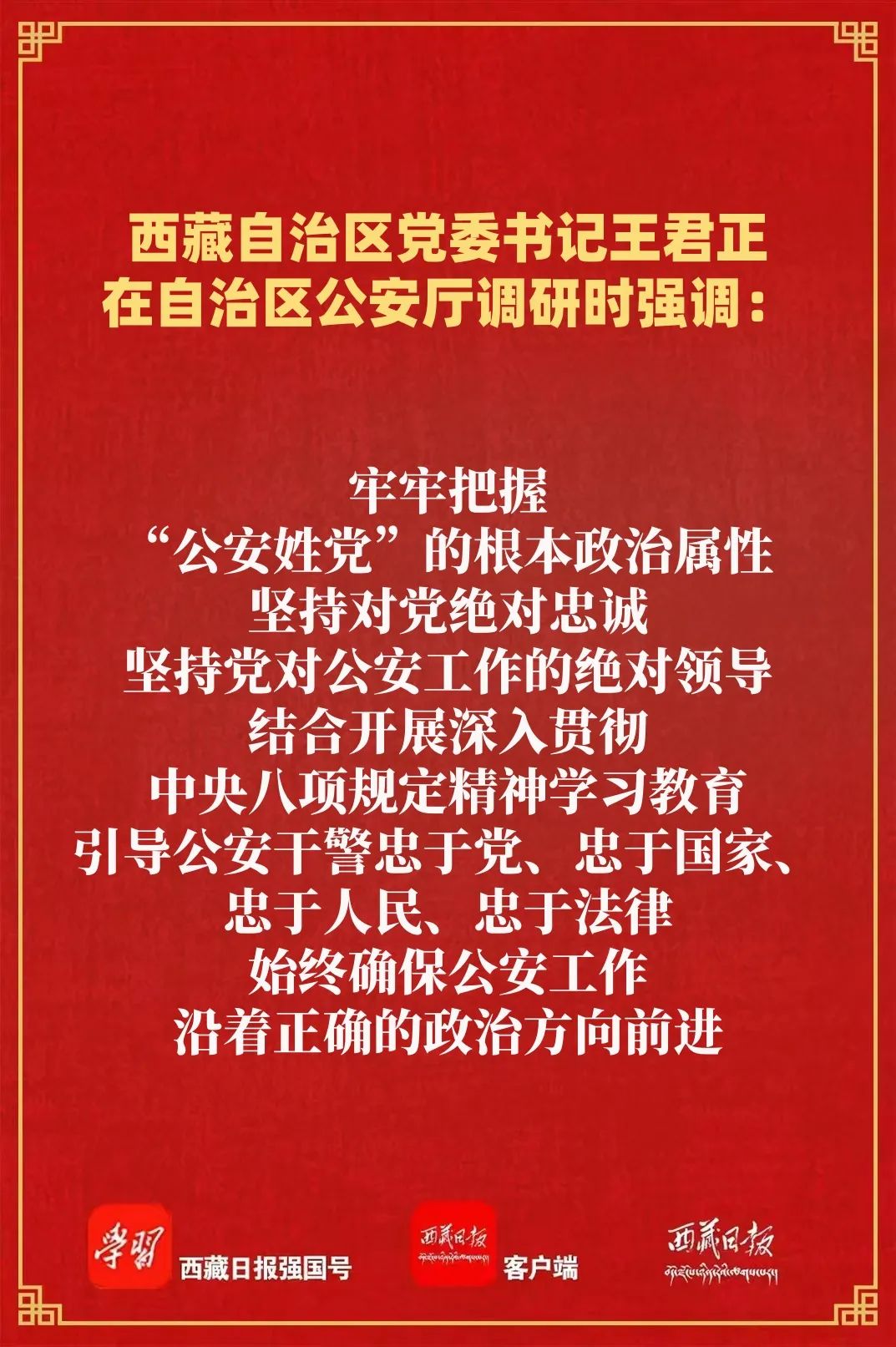 王君正强调,全区各级公安机关要坚持用习近平新时代中国特色社会主义思想统揽西藏公安工作全局,深刻领悟蕴含其中的科学世界观和方法论,自觉用以武装头脑、指导实践、推动工作,牢牢把握“公安姓党”的根本政治属性,坚持对党绝对忠诚,坚持党对公安工作的绝对领导,结合开展深入贯彻中央八项规定精神学习教育,引导公安干警忠于党、忠于国家、忠于人民、忠于法律,始终确保公安工作沿着正确的政治方向前进。