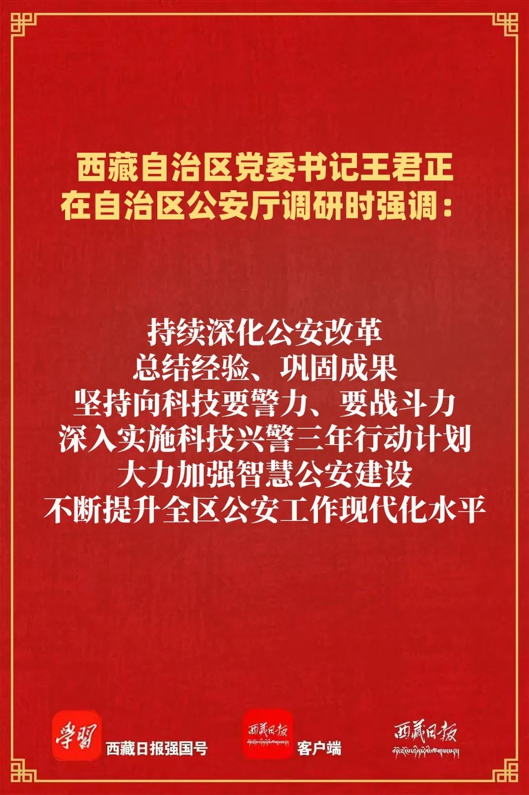 王君正强调,要紧紧围绕全区经济社会发展大局,依法履行职责使命,为社会主义现代化新西藏建设提供坚强安全保障。聚焦维护社会稳定和长治久安,不断提高社会治理体系和治理能力现代化水平,树牢总体国家安全观,坚持警钟长鸣、警惕常在,以科学化机制和常态化、法治化理念,把公安工作做在日常、做到经常、落实在基层;牢牢掌握反分裂斗争主动权,持续深化公共安全治理,完善防范化解重大风险隐患机制,提高预测预警预防各类风险能力,努力营造安全稳定的社会环境。聚焦服务高质量发展,完整准确全面贯彻新发展理念,坚持“三个赋予一个有利于”总要求,坚持一切从实际出发,更好统筹发展和安全、开放和安全,持续优化法治化营商环境;树立大抓基层鲜明导向,扎实做好基层基础工作,把群众身边的小事当作各级公安机关的大事来抓,既用好科学技术,又发挥好基层主观能动性和创造性,真正把好事办好、实事办实,不断增强各族群众的获得感幸福感安全感。聚焦筑牢国家生态安全屏障,严格落实青藏高原生态保护法,严守生态保护红线,支持生态环境保护和绿色发展,依法严厉打击各类破坏生态环境和危害生物安全的犯罪活动,扎实推进美丽西藏建设。聚焦强边富民,健全党政军警民合力强边固防机制,提升智慧边防建设水平,着力构筑维护国家安全的钢铁长城。持续深化公安改革,总结经验、巩固成果,坚持向科技要警力、要战斗力,深入实施科技兴警三年行动计划,大力加强智慧公安建设,不断提升全区公安工作现代化水平。