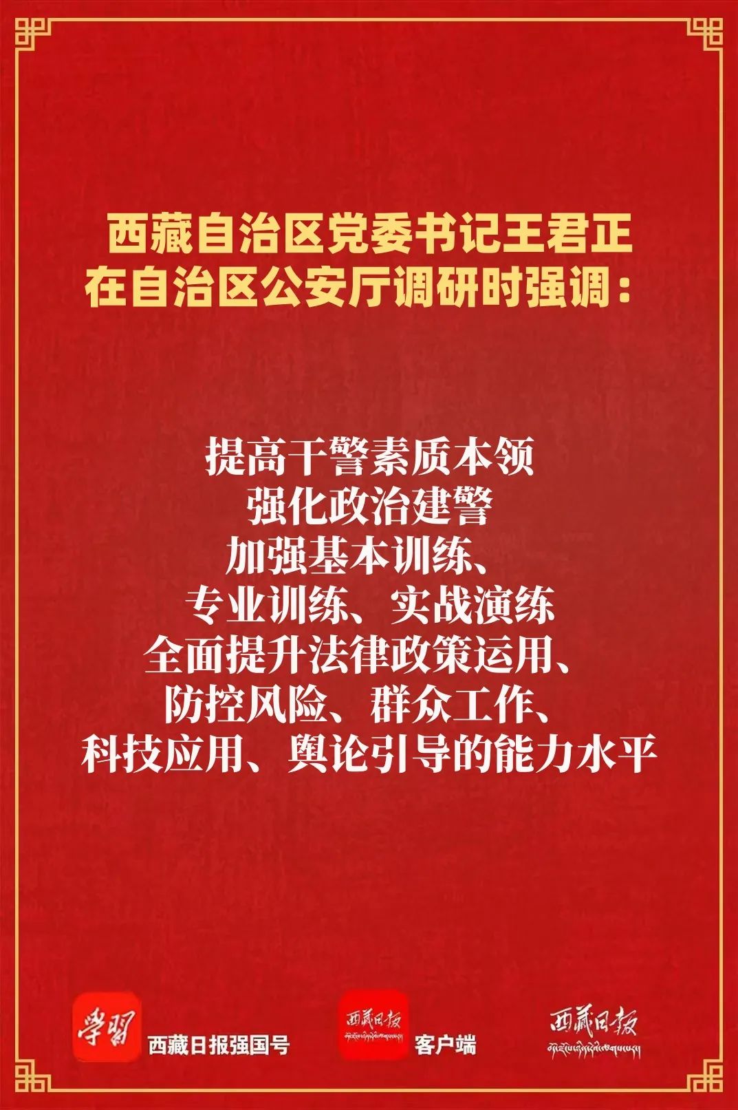 近日,自治区党委书记王君正在自治区公安厅调研时强调,要坚决贯彻落实习近平总书记关于新时代公安工作、西藏工作的重要指示和新时代党的治藏方略,发扬优良传统,恪尽职守、依法履职,努力为西藏长治久安和高质量发展作出新的贡献。