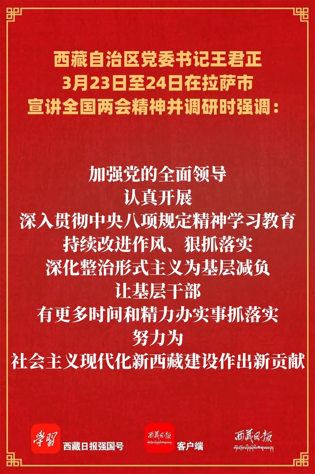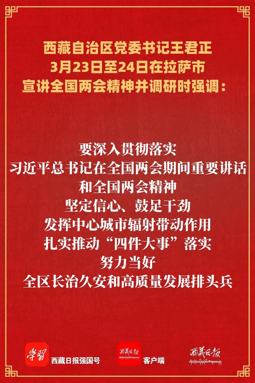 调研中,王君正指出,学习宣传贯彻全国两会精神是当前和今后一个时期的重要政治任务。拉萨市要提高政治站位,深刻领悟“两个确立”的决定性意义,认真贯彻落实习近平总书记在全国两会期间重要讲话和全国两会精神,增强责任感使命感,真抓实干、创先争优,当好全区长治久安和高质量发展排头兵,确保党中央决策部署和自治区党委工作安排落地见效。