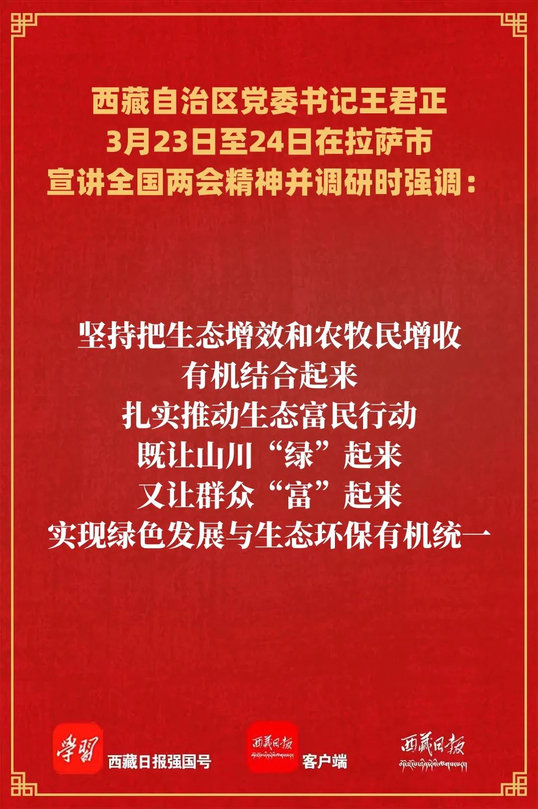 3月23日至24日,自治区党委书记王君正前往拉萨市达孜区、墨竹工卡县宣讲全国两会精神,就农业生产、生态环保、产业发展、寺庙管理开展调研。强调,要深入贯彻落实习近平总书记在全国两会期间重要讲话和全国两会精神,坚定信心、鼓足干劲,发挥中心城市辐射带动作用,扎实推动“四件大事”落实,努力当好全区长治久安和高质量发展排头兵。