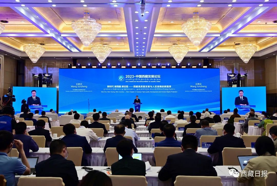 王君正在致辞中代表西藏自治区党委、政府和全区各族人民,向与会各位嘉宾表示热烈欢迎和衷心感谢。他说,习近平总书记格外关心中国西藏发展论坛,继2019年致信论坛开幕,此次再次专门发来贺信,充分体现了习近平总书记和党中央对西藏工作的高度重视和关心支持,为推动西藏长治久安和高质量发展提出了新期望、新要求,进一步指明了前进方向、提供了根本遵循。在中国共产党的领导下,经过70多年特别是新时代以来的快速发展,一个政治安定、社会稳定、经济发展、民族团结、宗教和睦、边防巩固、人民安居乐业的社会主义新西藏呈现在世人面前。实践充分证明,习近平总书记关于西藏工作的重要指示英明正确,党中央关于西藏工作的方针政策英明正确,新时代党的治藏方略英明正确。新征程上,我们将坚持以习近平新时代中国特色社会主义思想为指导,认真学习贯彻习近平总书记关于西藏工作的重要指示和新时代党的治藏方略,坚定不移把习近平总书记为西藏确定的“稳定、发展、生态、强边”四件大事落到实处。坚持以铸牢中华民族共同体意识为主线,促进各民族交往交流交融,在创建全国民族团结进步模范区上迈出新步伐;坚持以人民为中心的发展思想,全面贯彻落实新发展理念,在创建高原经济高质量发展先行区上开创新局面;坚持绿水青山就是金山银山的理念,在创建国家生态文明高地上展现新作为;坚持固边与兴边并重,着力提升边境地区基础设施建设、公共服务、产业发展水平,在创建国家固边兴边富民行动示范区上取得新成效,奋力推进西藏长治久安和高质量发展 ,努力建设团结富裕文明和谐美丽的社会主义现代化新西藏。